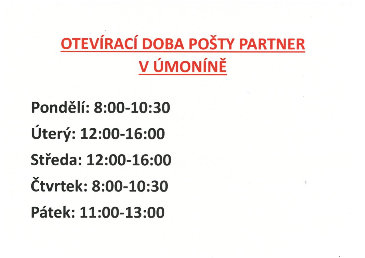 OTEVÍRACÍ DOBA POŠTY PARTNER V ÚMONÍNĚ od 11.8.2025 Pondělí: 8:00-10:30 Úterý: 12:00-16:00 Středa: 12:00-16:00 Čtvrtek: 8:00-10:30 Pátek: 11:00-13:00